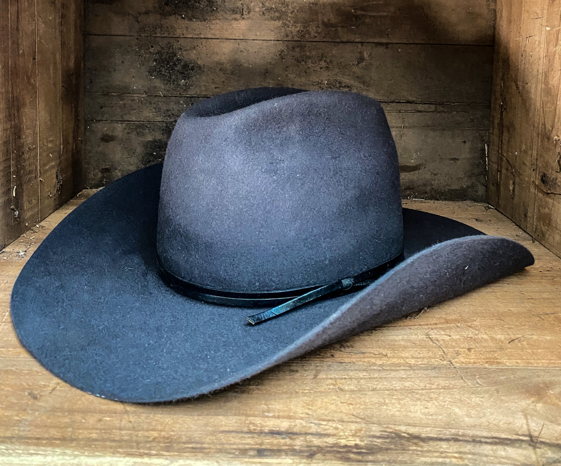 Full western weight rabbit fur felt, leather sweat and tied leather hat band