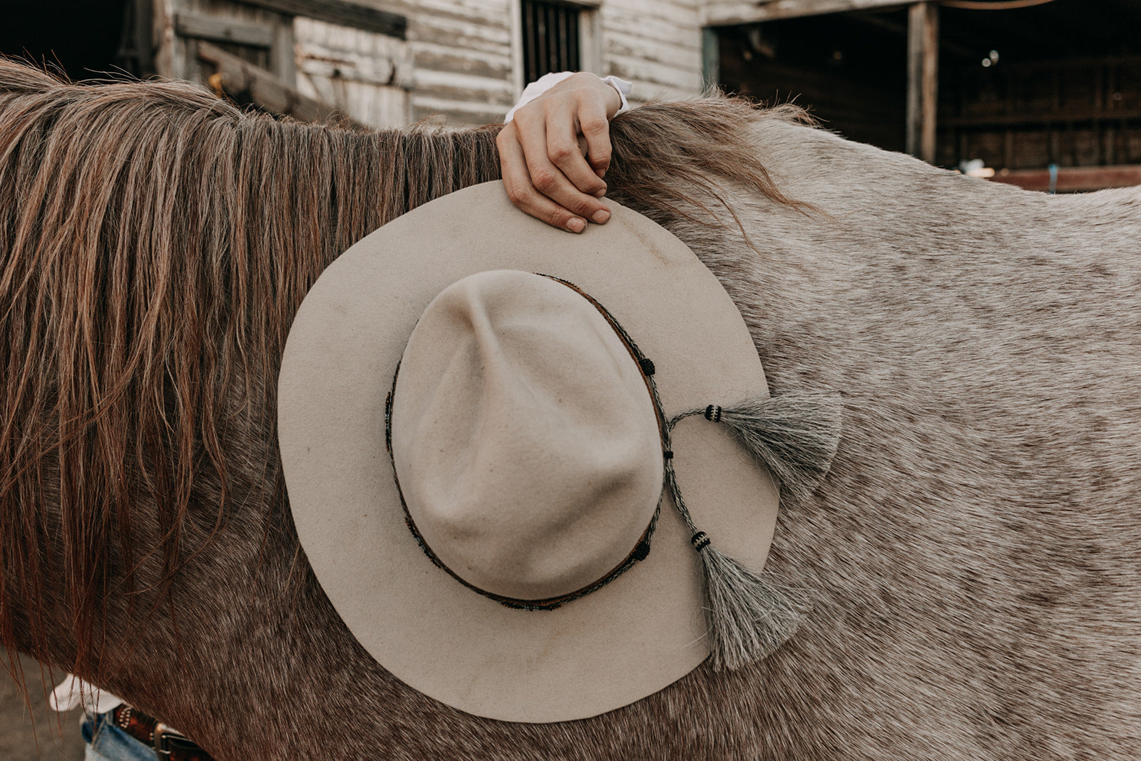 Full western weight rabbit fur felt, with leather sweat, leather hat band, finished with a horsehair band